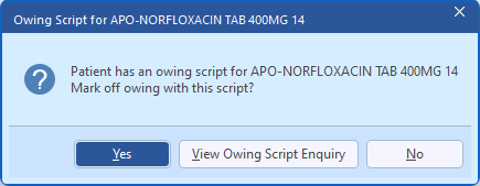 1. Click Yes to open the Owing Script Enquiry window.
