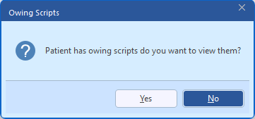 When a patient with an owing script is selected on the Dispense Form or the dispenser scans a token for a customer who has owing scripts where the drug does not match the recorded owing, the Owing Scripts prompt is displayed.