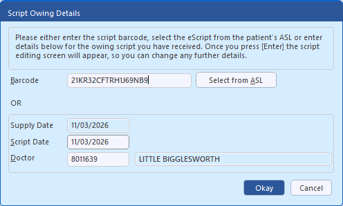 c. If the script is a paper script with multiple items or if you are manually receiving the owing e.g. you may have a paper script without a PDS barcode enter the Script Date and Doctor, then click Okay and go to Step 7.