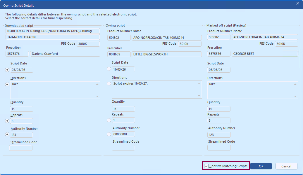 If the drug details match, the Confirm Matching Scripts checkbox is automatically ticked.