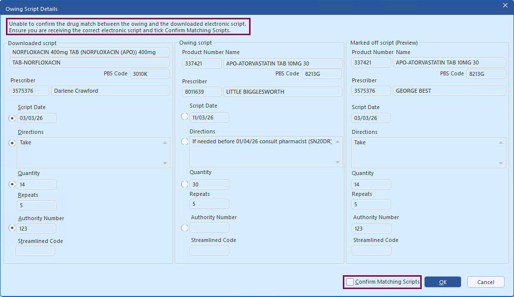 If the drug details do not match, the Confirm Matching Scripts checkbox is unticked.