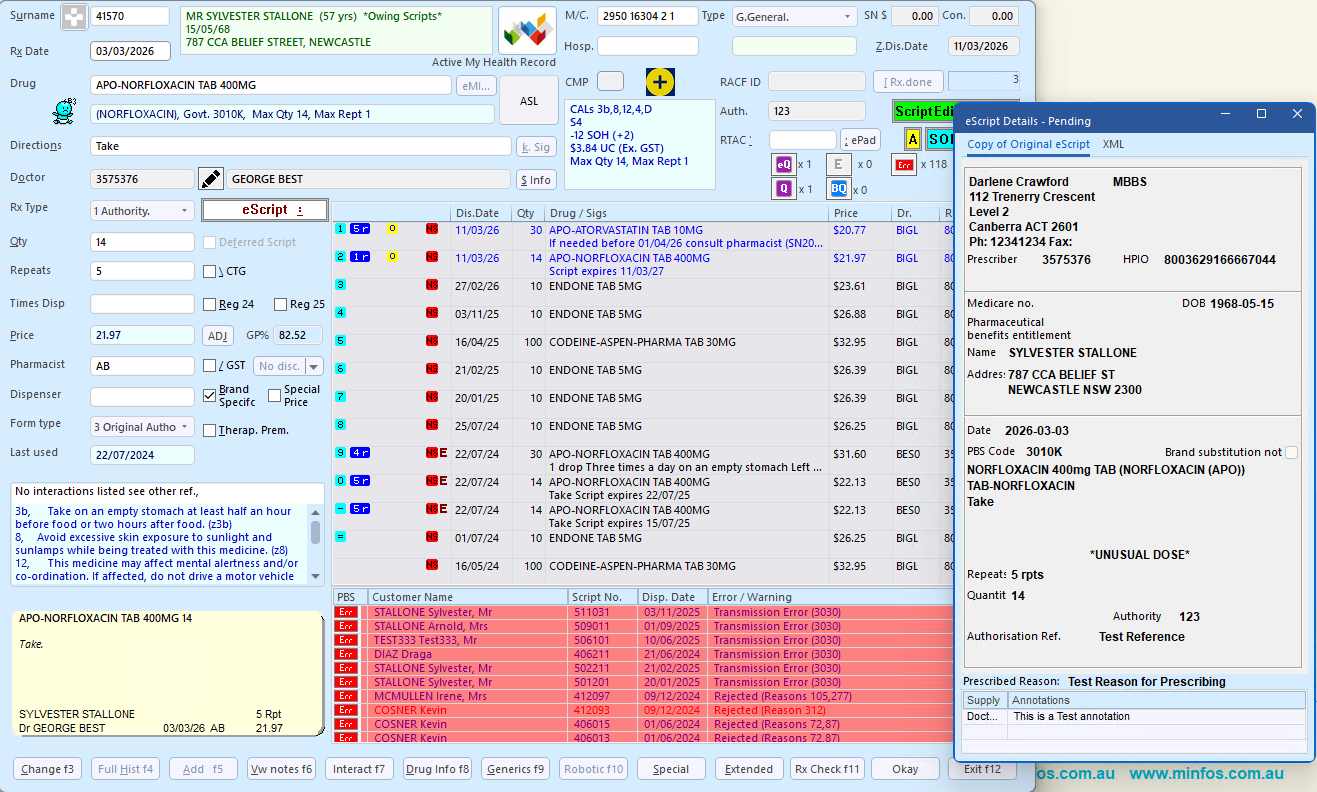 Note If the patient details on the eScript do not match the patient the owing was dispensed to Minfos will prevent the owing from being received and the Error: Unable to Receive Owing prompt is displayed.